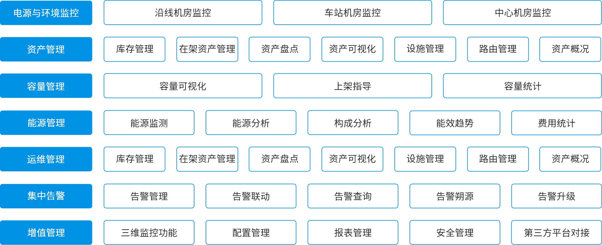 計通智能緊跟新基建和智慧軌道交通發(fā)展戰(zhàn)略,結(jié)合行業(yè)特性,量身打造了一系列具有軌道交通行業(yè)特色的智能監(jiān)控數(shù)字化解決方案,對中心及災備機房、線路站點、檔案庫房等實現(xiàn)電源、環(huán)境、安防等基礎配套進行集中監(jiān)控、實時監(jiān)測、預警聯(lián)動、智能運維等。公司目前打造的電源及環(huán)境監(jiān)控系統(tǒng)、綜合運維管理系統(tǒng)、智慧廁所監(jiān)控系統(tǒng)、智慧庫房監(jiān)控系統(tǒng)、數(shù)字孿生、無人值守系統(tǒng)等解決方案,已得到行業(yè)成熟、廣泛運用。