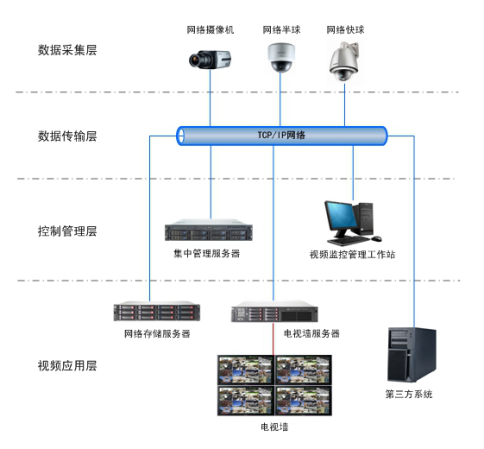 網(wǎng)絡(luò)視頻監(jiān)控系統(tǒng)由前端數(shù)據(jù)采集層、數(shù)據(jù)傳輸層、控制管理層、視頻應(yīng)用層四個(gè)部分組成。數(shù)據(jù)采集層由網(wǎng)絡(luò)攝像機(jī)或模擬攝像機(jī)+編碼器的方式組成,主要負(fù)責(zé)獲取視頻圖像。數(shù)據(jù)傳輸層由網(wǎng)絡(luò)交換機(jī)及傳輸線纜組成,其中網(wǎng)絡(luò)交換機(jī)負(fù)責(zé)數(shù)據(jù)交換??刂乒芾韺佑杉泄芾矸?wù)器與視頻監(jiān)控管理工作站組成,通過對(duì)視頻監(jiān)控管理工作站設(shè)置不同的權(quán)限,實(shí)現(xiàn)對(duì)不同權(quán)限的用戶管理。視頻應(yīng)用層由存儲(chǔ)轉(zhuǎn)發(fā)服務(wù)器、解碼服務(wù)器組成,主要負(fù)責(zé)制圖像轉(zhuǎn)發(fā)、存儲(chǔ)及視頻輸出。