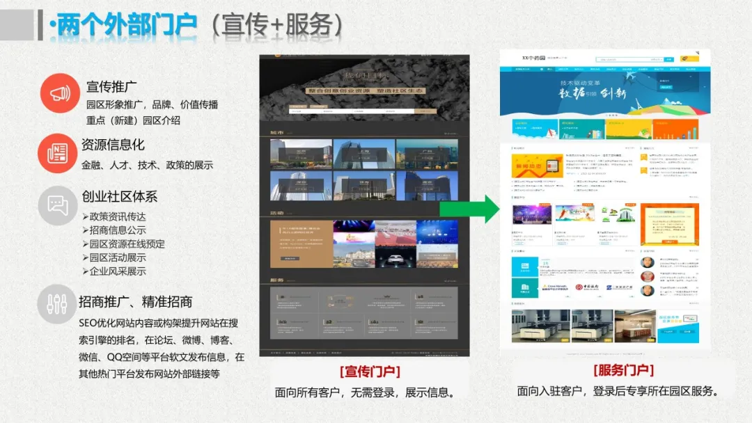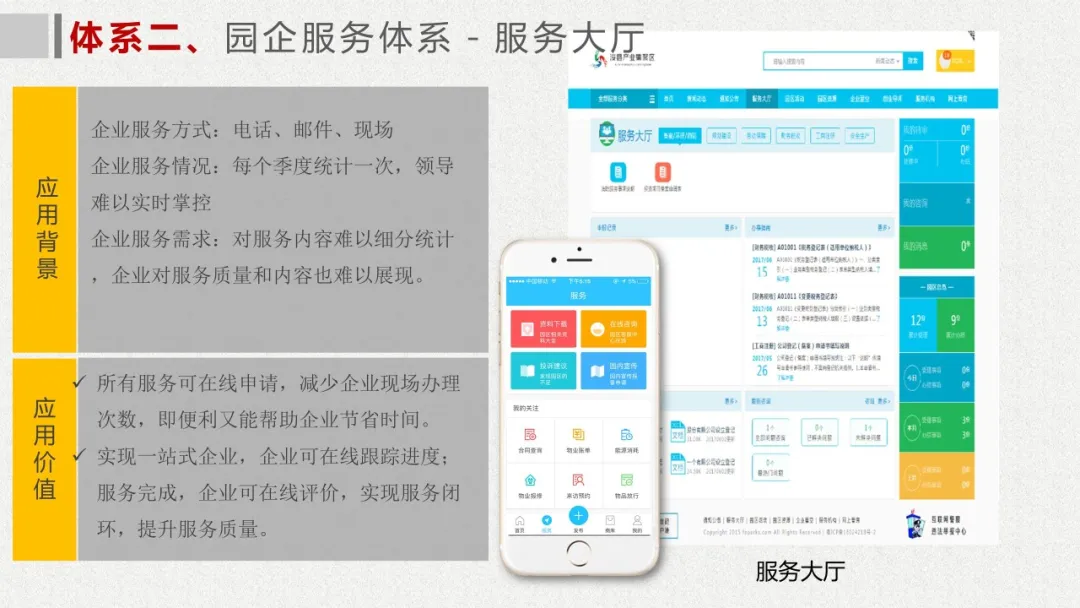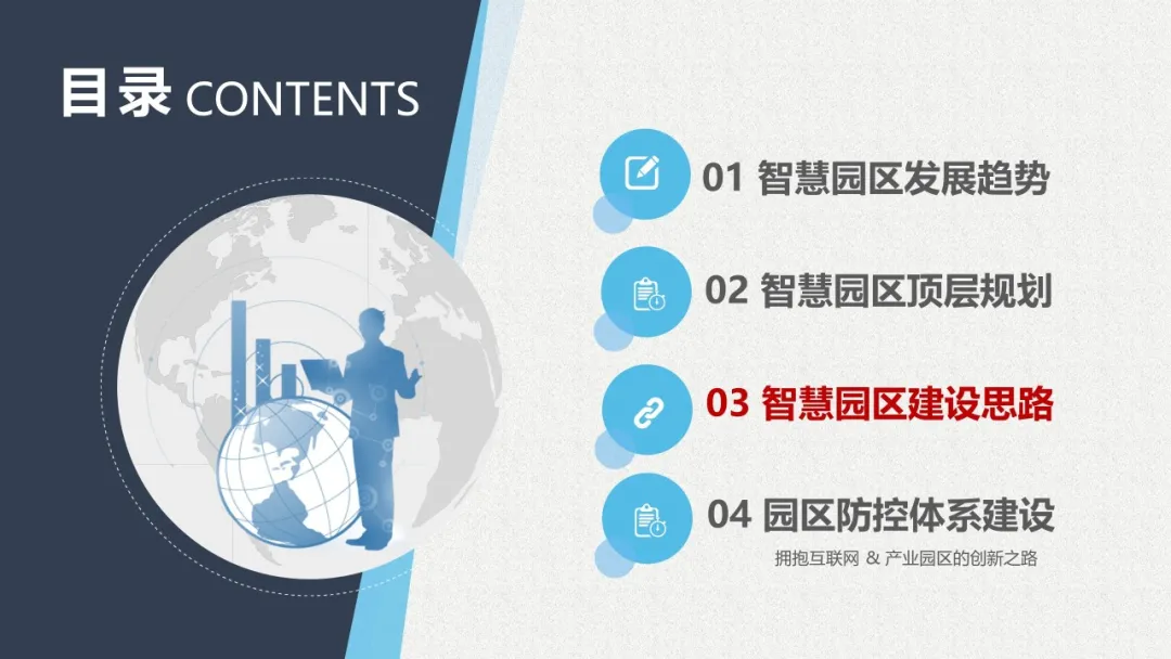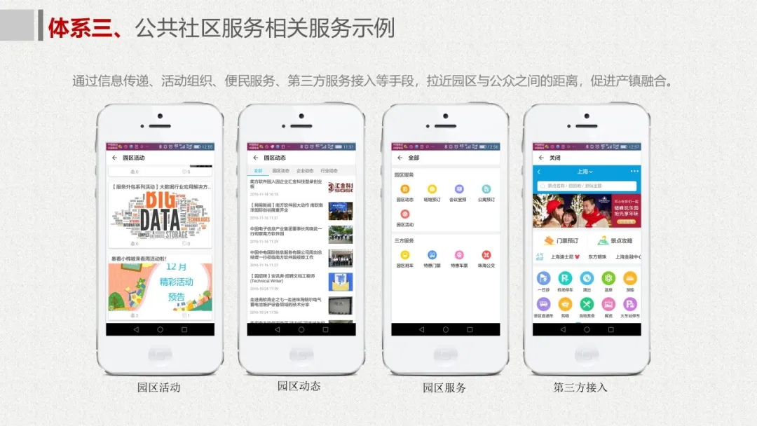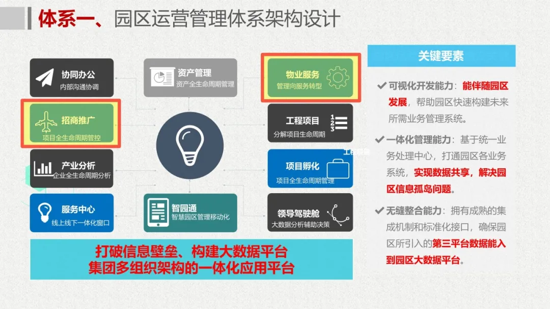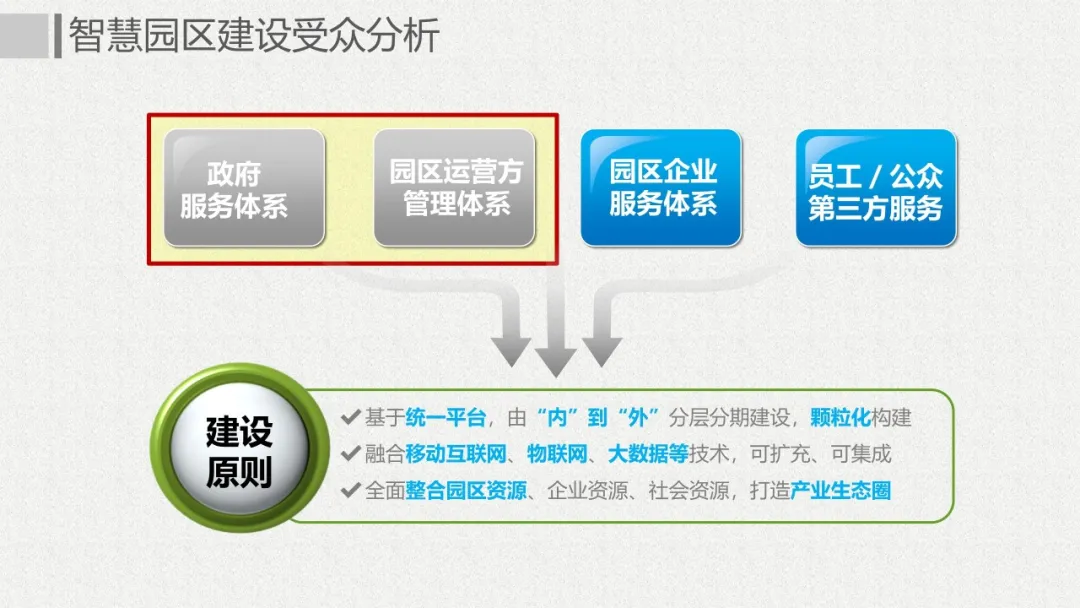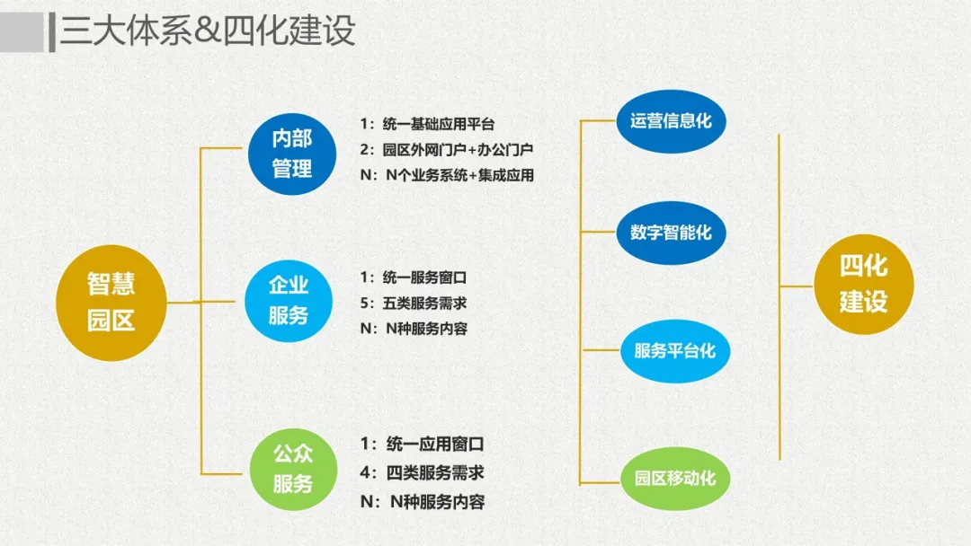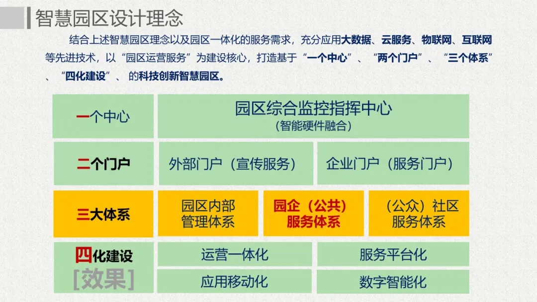 智慧園區(qū)理念以及園區(qū)一體化的服務(wù)需求,充分應(yīng)用大數(shù)據(jù)、云服務(wù)、物聯(lián)網(wǎng)、互聯(lián)網(wǎng)等先進(jìn)技術(shù),以“園區(qū)運營服務(wù)”為建設(shè)核心,打造基于“一個中心”、“兩個門戶”、“三個體系”、“四化建設(shè)”的科技創(chuàng)新智慧園區(qū)。