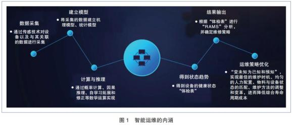 智能運維是通過對設(shè)備狀態(tài)數(shù)據(jù)進行采集、存儲、加工,分析和判斷數(shù)據(jù)信息與設(shè)備的健康狀態(tài)是否吻合,并輸出判斷的結(jié)果,進而實現(xiàn)對維修策略的指導(dǎo)(圖 1)。其通過物聯(lián)網(wǎng)和不同功能的算法模塊實現(xiàn),而實現(xiàn)關(guān)鍵在于以下 2 點:①搭建強大且可靠的數(shù)據(jù)采集及終端回饋系統(tǒng),包括傳感器、網(wǎng)絡(luò)通信及數(shù)據(jù)庫;②開發(fā)科學(xué)合理的分析算法,包括依據(jù)目標要求設(shè)計的數(shù)學(xué)模型和決策模型。