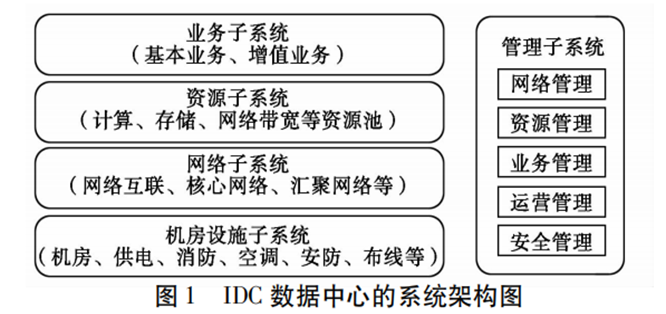 · 管理子系統(tǒng)負責對數(shù)據(jù)中心的基礎設施、網(wǎng)絡、計算機資源進行資源管理、系統(tǒng)運行管理,安全管理,并和客戶合作進行數(shù)據(jù)中心承載的各種業(yè)務運營管理。