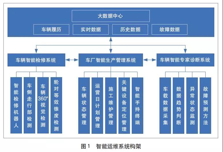 智能運維系統(tǒng)是建立在設(shè)備基礎(chǔ)上的、以狀態(tài)修模式為主要發(fā)展目標的智能化、數(shù)字化系統(tǒng),其依托大數(shù)據(jù)中心,結(jié)合設(shè)備履歷數(shù)據(jù),并借助實時監(jiān)控設(shè)備,采集和分析城市軌道交通車輛的運行和檢修數(shù)據(jù),判斷設(shè)備故障趨勢,診斷設(shè)備的運用健康狀態(tài),從而實現(xiàn)故障預(yù)警和分級報警,指導(dǎo)關(guān)鍵設(shè)備現(xiàn)場維修作業(yè)的智能化管理。