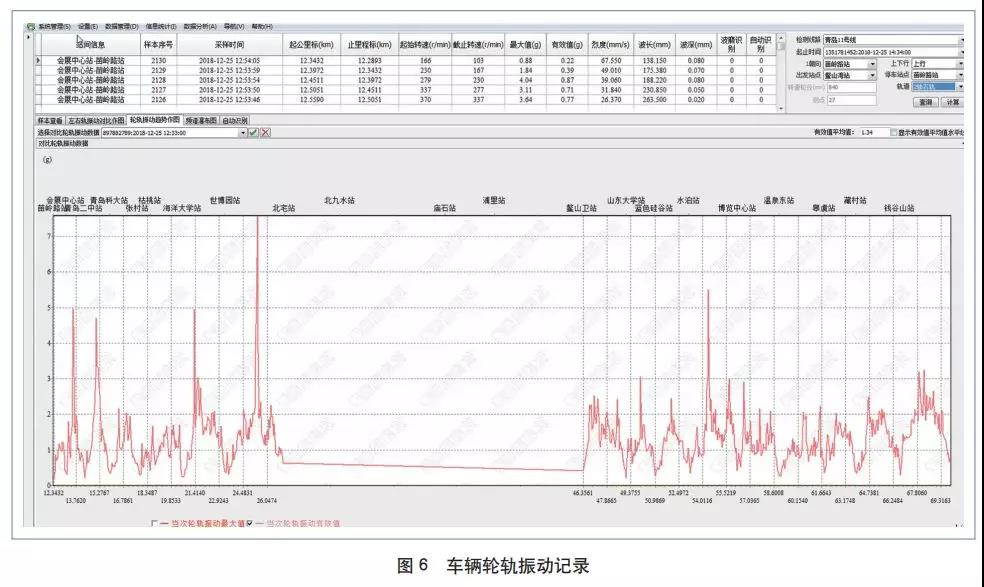 利用車載狀態(tài)監(jiān)測設(shè)備采集的車輛實時狀態(tài)數(shù)據(jù),并根據(jù)系統(tǒng)或部件的歷史監(jiān)控數(shù)據(jù),對于專家系統(tǒng)給定閾值內(nèi)的數(shù)據(jù)抖動進行變化趨勢分析和比對。圖 6 顯示了車輛走行部軸箱軸承狀態(tài)監(jiān)測設(shè)備在某運行區(qū)間所記錄的 2 軸右軌振動數(shù)據(jù)。在圖中 K25+292~K25+400 區(qū) 間,最大振動有效值為 7.58g,波磨路段的振動頻率為400~450 Hz,未超出系統(tǒng)給定的正常狀態(tài)閾值,但相較于該軸的歷史數(shù)據(jù)記錄,本次振動幅度特別大,因此系統(tǒng)記錄下數(shù)據(jù)變化趨勢并發(fā)出報警信號,提示檢修人員檢查該部位走行部狀態(tài)。