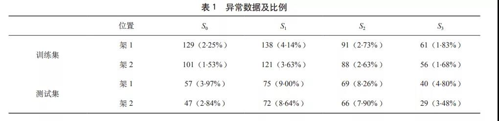 車輛智能專家診斷系統(tǒng)會提取影響車輛運行狀態(tài)的關(guān)鍵數(shù)據(jù)指標和過程變量,作為故障判定的主要參照,在采集所有的狀態(tài)數(shù)據(jù)后,對車輛或系統(tǒng)狀態(tài)對應(yīng)時間窗內(nèi)的所有模擬量數(shù)據(jù)進行統(tǒng)計,提取區(qū)段最大值、最小值、平均值和平均差等不同參數(shù)作為區(qū)間特征值進行數(shù)據(jù)重組。然后,將同一車架的同一類車輛或設(shè)備狀態(tài)數(shù)據(jù)作為學(xué)習(xí)樣本,采用無監(jiān)督機器學(xué)習(xí)算法對所得數(shù)據(jù)進行異常檢測。整個數(shù)據(jù)集按照適當?shù)谋壤指顬橛?xùn)練數(shù)據(jù)集和測試數(shù)據(jù)集,用相應(yīng)的算法進行驗證測試,如表 1 所示。