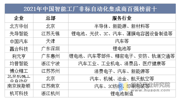 2021年中國智能工廠非標自動化集成商百強榜前十