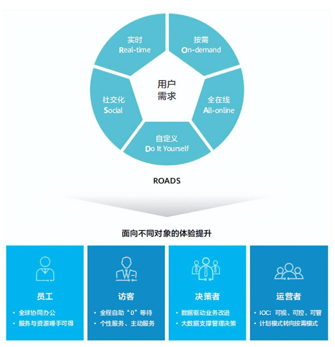 面向園區(qū)不同對(duì)象,提供ROADS化體驗(yàn),幫助員工提升工作效率,帶給訪客賓至如歸的體驗(yàn),使能運(yùn)營(yíng)從計(jì)劃模式向按需模式轉(zhuǎn)變,支撐基于大數(shù)據(jù)的管理決策。