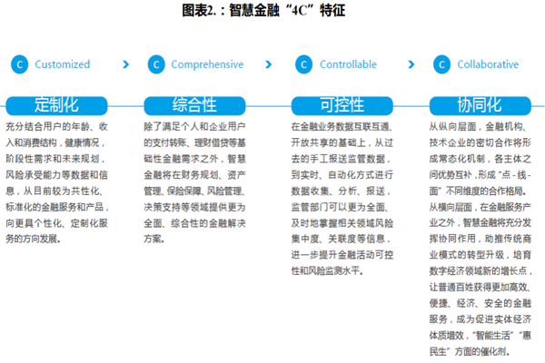 智慧金融的特征主要體現(xiàn)在定制化、綜合性、可控性與協(xié)同化四個(gè)方面: