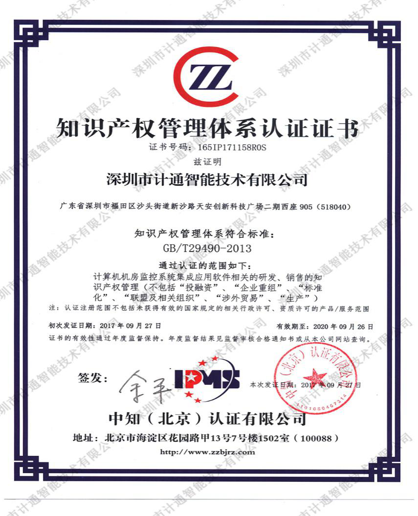 2017年9月27日,深圳計(jì)通迎來了振奮人心的消息——深圳市計(jì)通智能技術(shù)有限公司以其完整規(guī)范的知識(shí)產(chǎn)權(quán)管理流程及卓有成效的深入實(shí)施,順利取得中知(北京)認(rèn)證有限公司頒發(fā)的《知識(shí)產(chǎn)權(quán)管理體系認(rèn)證證書》。這意味著計(jì)通在知識(shí)產(chǎn)權(quán)領(lǐng)域獲得了重要認(rèn)可,計(jì)通在知識(shí)產(chǎn)權(quán)方面進(jìn)一步規(guī)范、綜合競爭力得到進(jìn)一步提升。