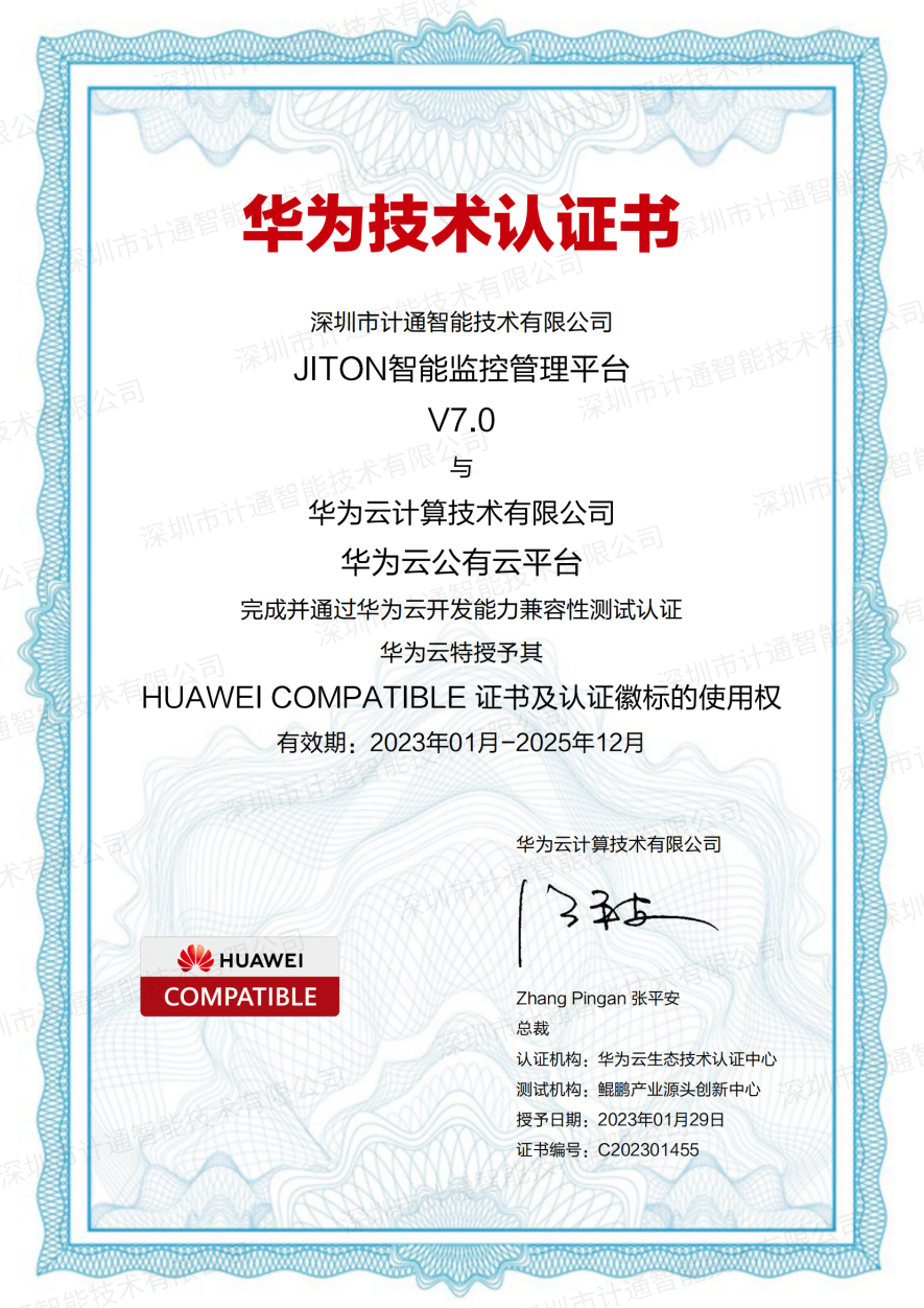 近日,計通智能的科技實力再次得到了官方肯定。1月29日,計通智能自主研發(fā)的“JITON智能監(jiān)控管理平臺V7.0”經(jīng)過華為的多項嚴(yán)格測試評估,順利完成了兼容性測試,最終獲得了華為技術(shù)有限公司授予的HUAWEI COMPATIBLE證書及相關(guān)認(rèn)證徽標(biāo)的使用權(quán)。