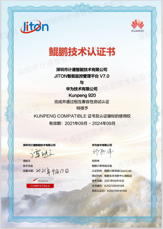 ·HUAWEI COMPATIBLE證書致力于第三方廠商產(chǎn)品與華為互操作和互聯(lián)互通測試以保障雙方產(chǎn)品能夠兼容運行,為客戶提供既定的產(chǎn)品功能。它的獲取表明“JITON智能監(jiān)控管理平臺V7.0”具有業(yè)內(nèi)認(rèn)可的高兼容性、實用性和穩(wěn)定性。